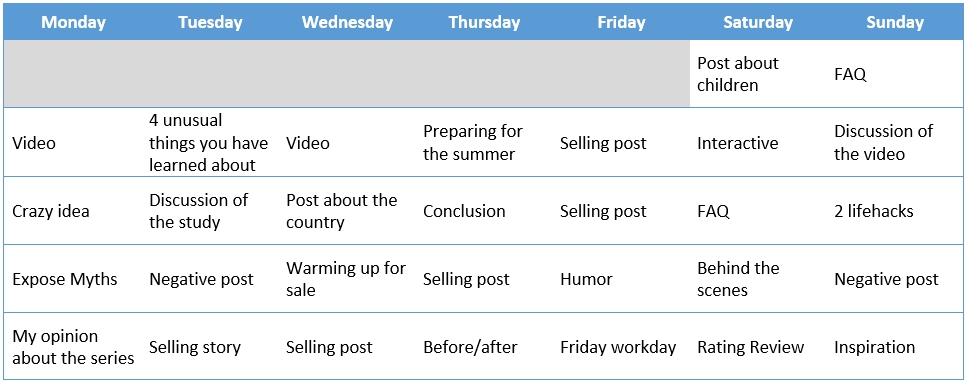Categories help you introduce organization and discipline to your flight of fancy. All possible posts and stories topics can be conditionally divided into a few categories. That’s like a TV guide in a newspaper, only it is designed for us and not the audience.