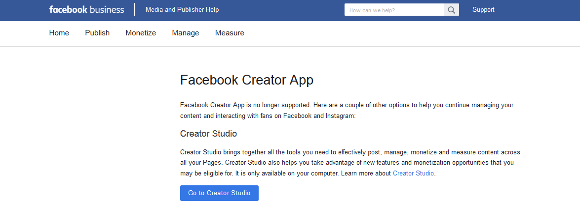 Facebook has disabled the Creator app for creating content, managing pages, and monitoring user activity. To replace it, Facebook recommends the Pages Manager app which has no functionality to post stories from apps to the brand page.