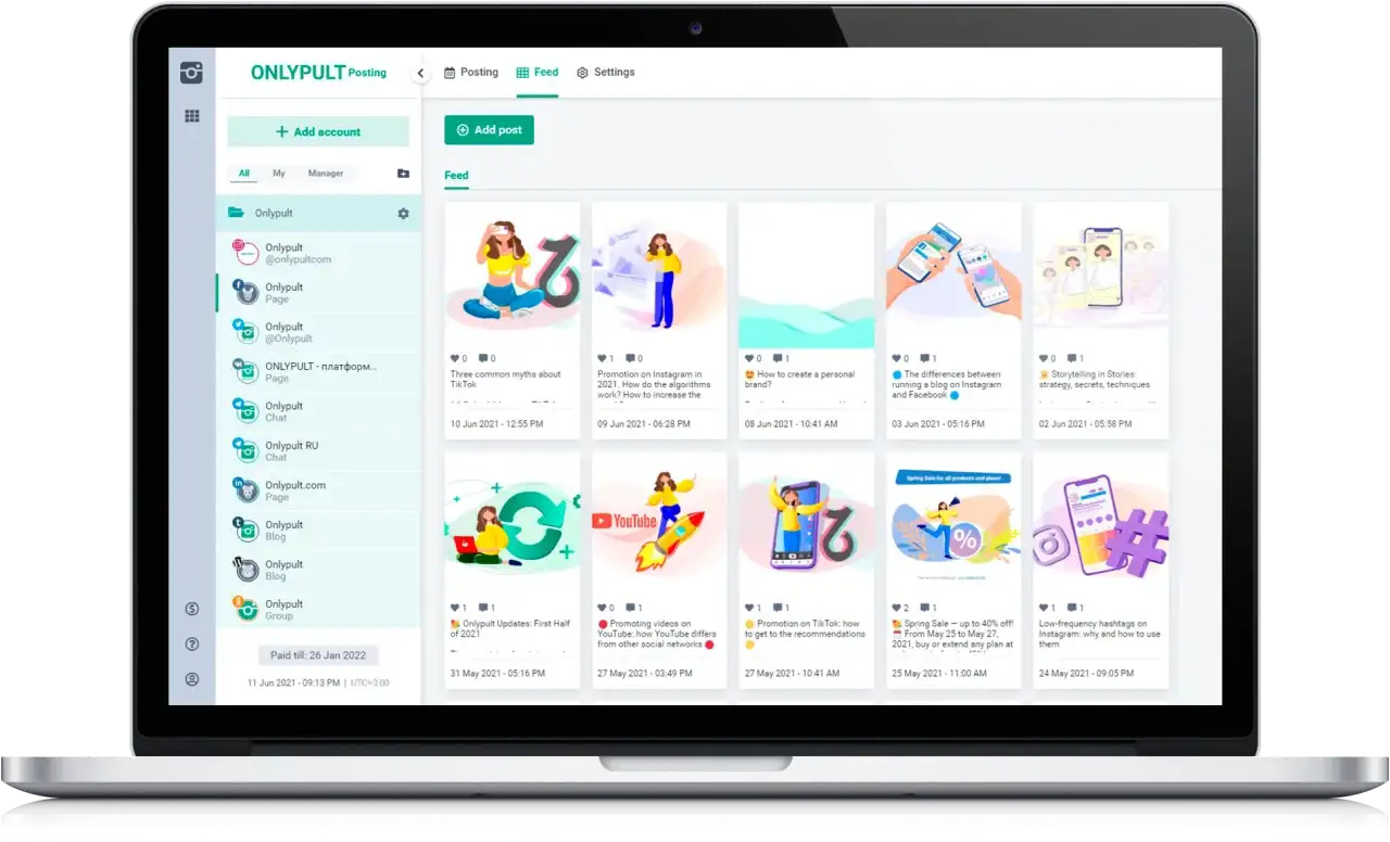 Regístrese en Onlypult y ponga en practica herramientas digitales modernas: una única plataforma para trabajar con redes sociales, conveniente para el trabajo en equipo, una herramienta para crear micro páginas landing, monitoreo de menciones y una plataforma para multi-streaming.