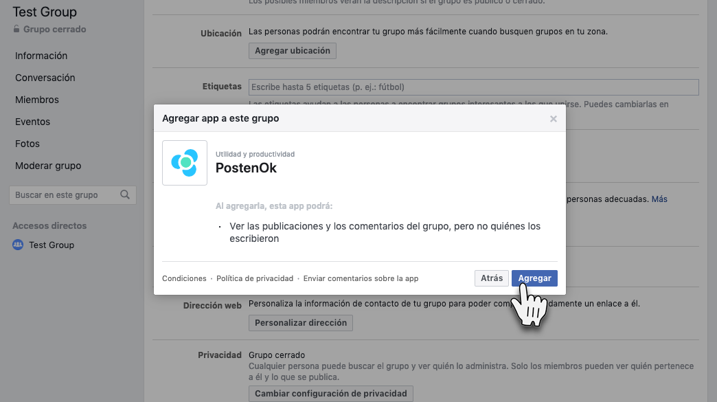 Sólo los administradores pueden enlazar grupos de Facebook (o moderadores si en la configuración del grupo se especifica que todos los miembros del grupo están autorizados a publicar).