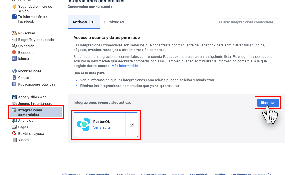 Seleccione la aplicación en la sección “Integraciones empresariales” y pulse “Eliminar”.