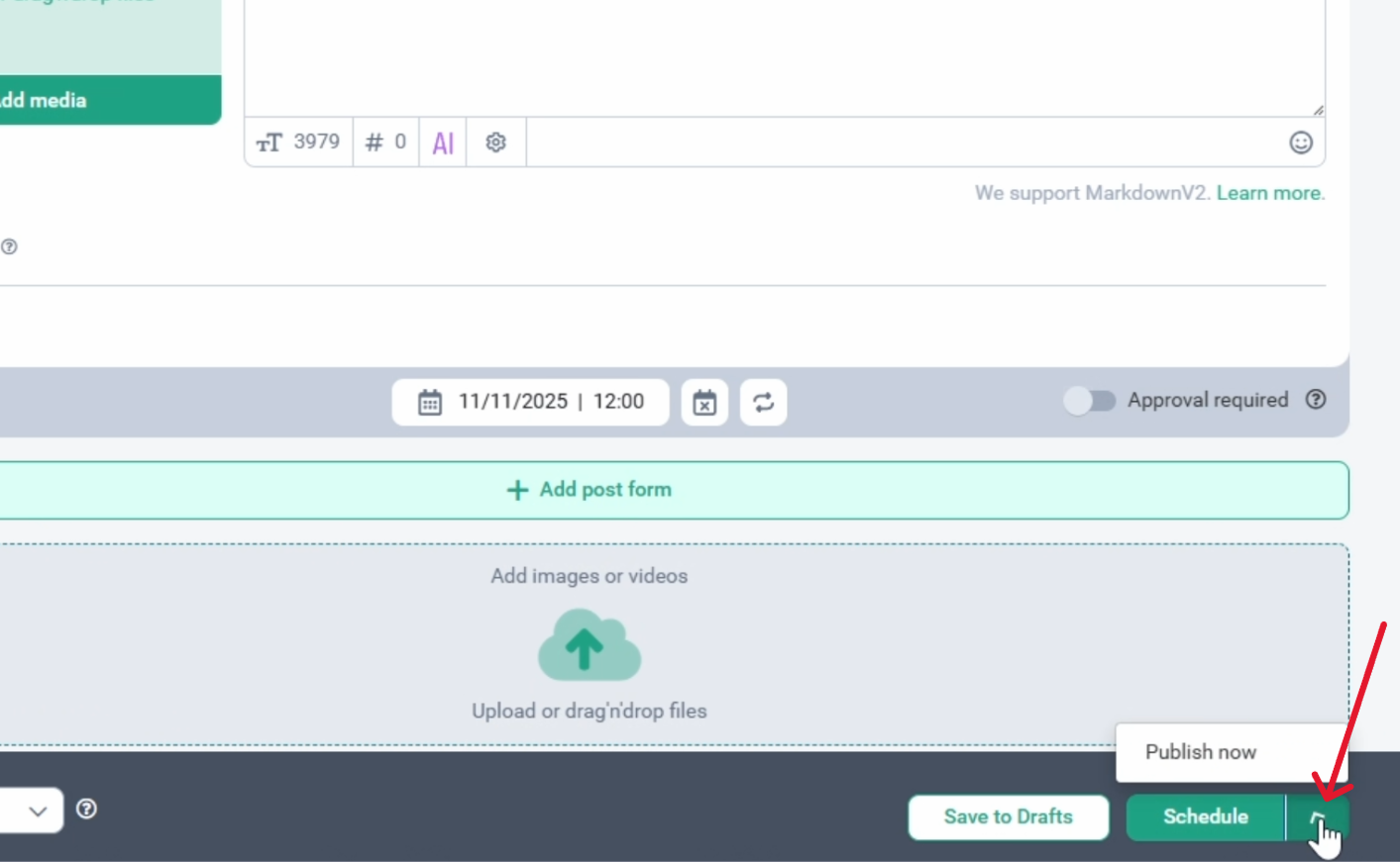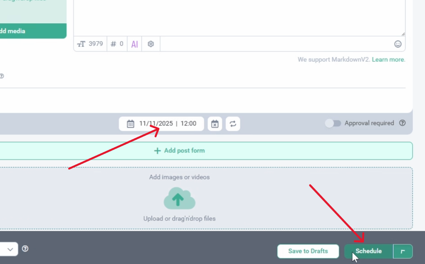 - If you need to schedule a post for a specific time, select the date and time, and then click “Schedule”.