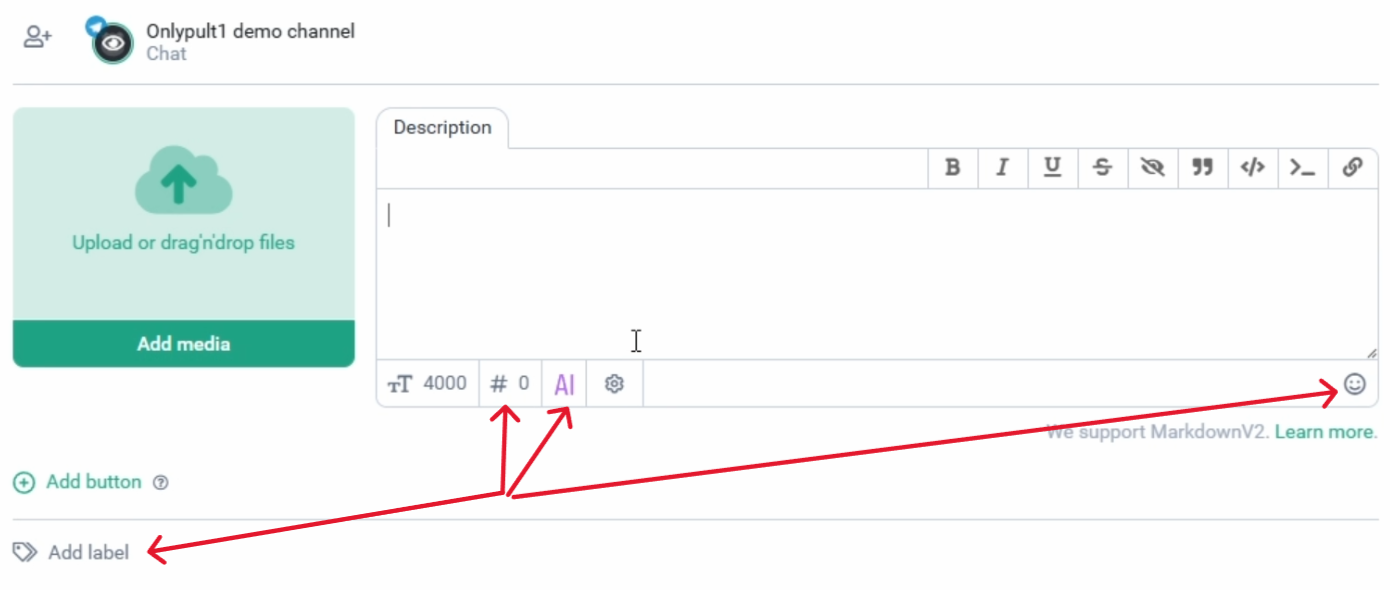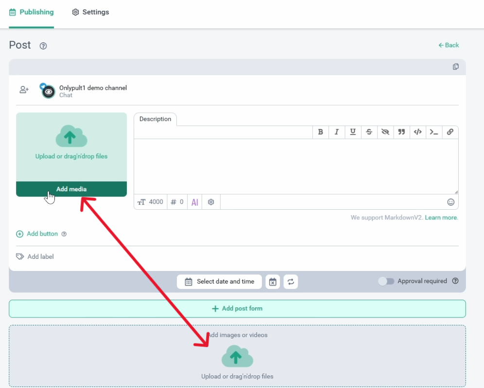 To add a photo or video, you can either click on “Add Media” or drag the media files to the dotted line.