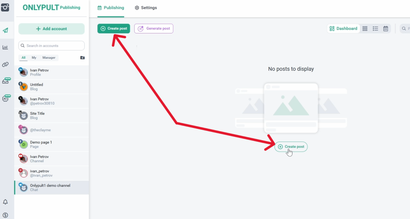 Clicking on “Create a post” opens a single publication form with a single post form.