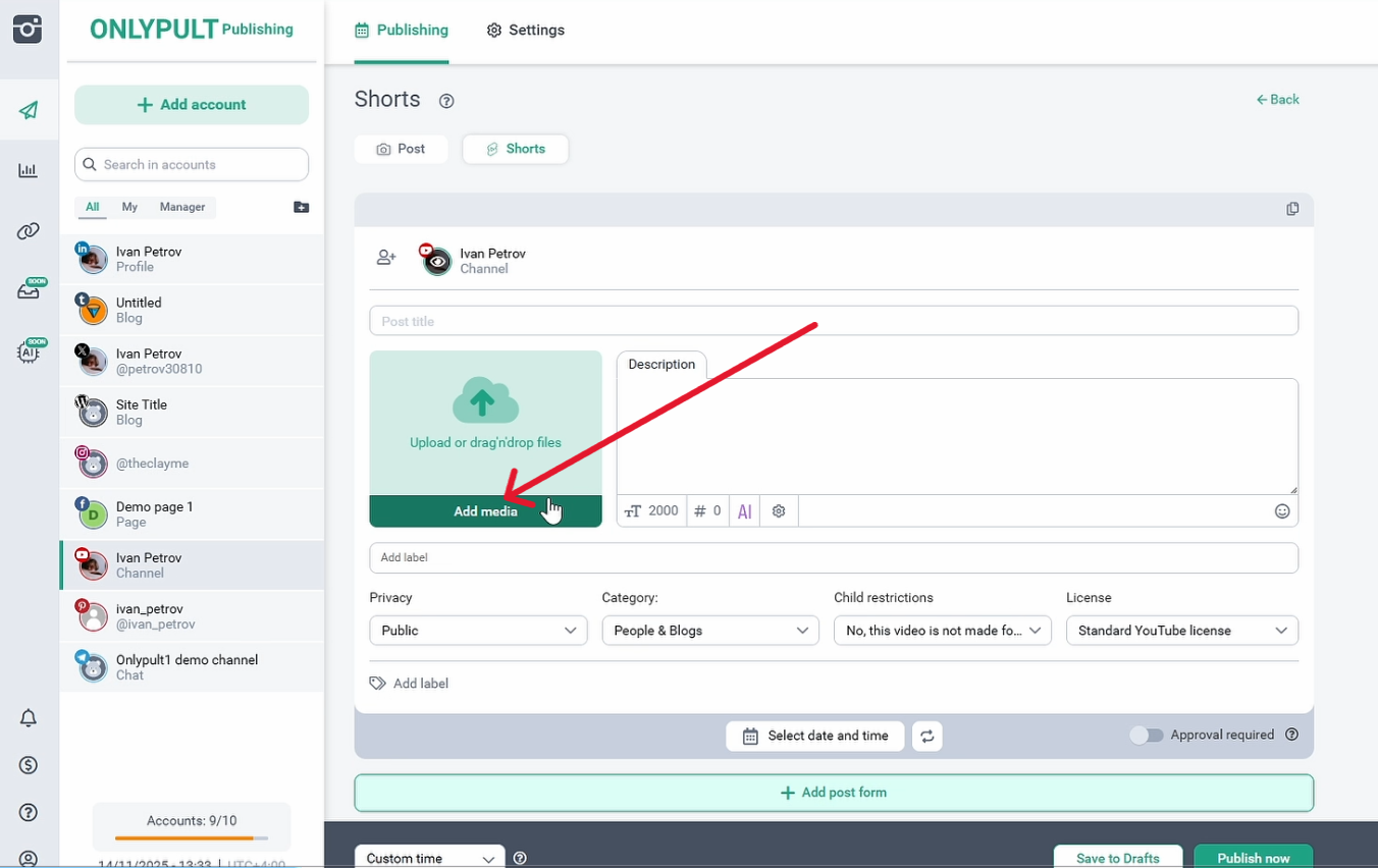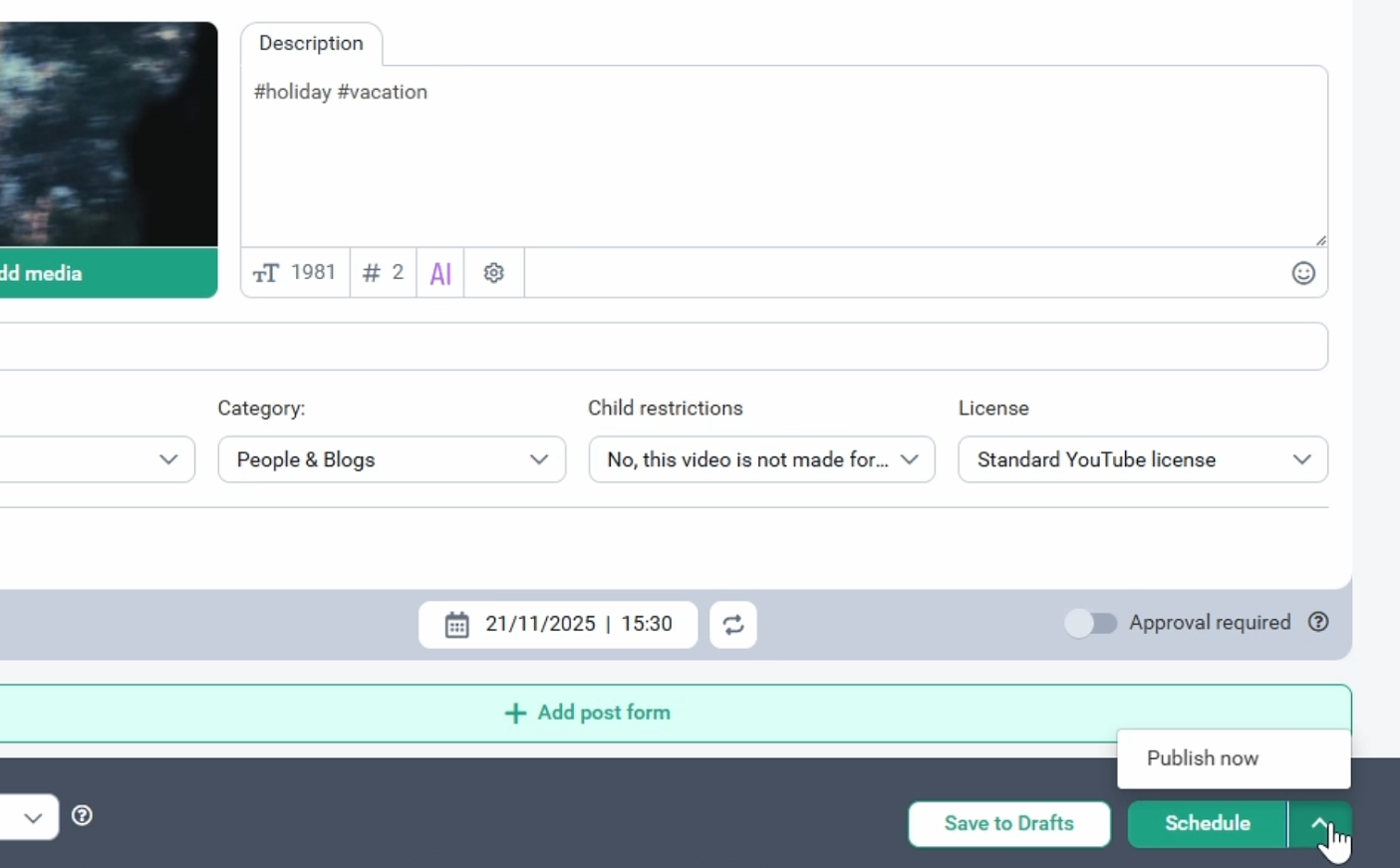 - After adding everything you need, set the publication time or click “Publish Now” or “Save to Drafts”.