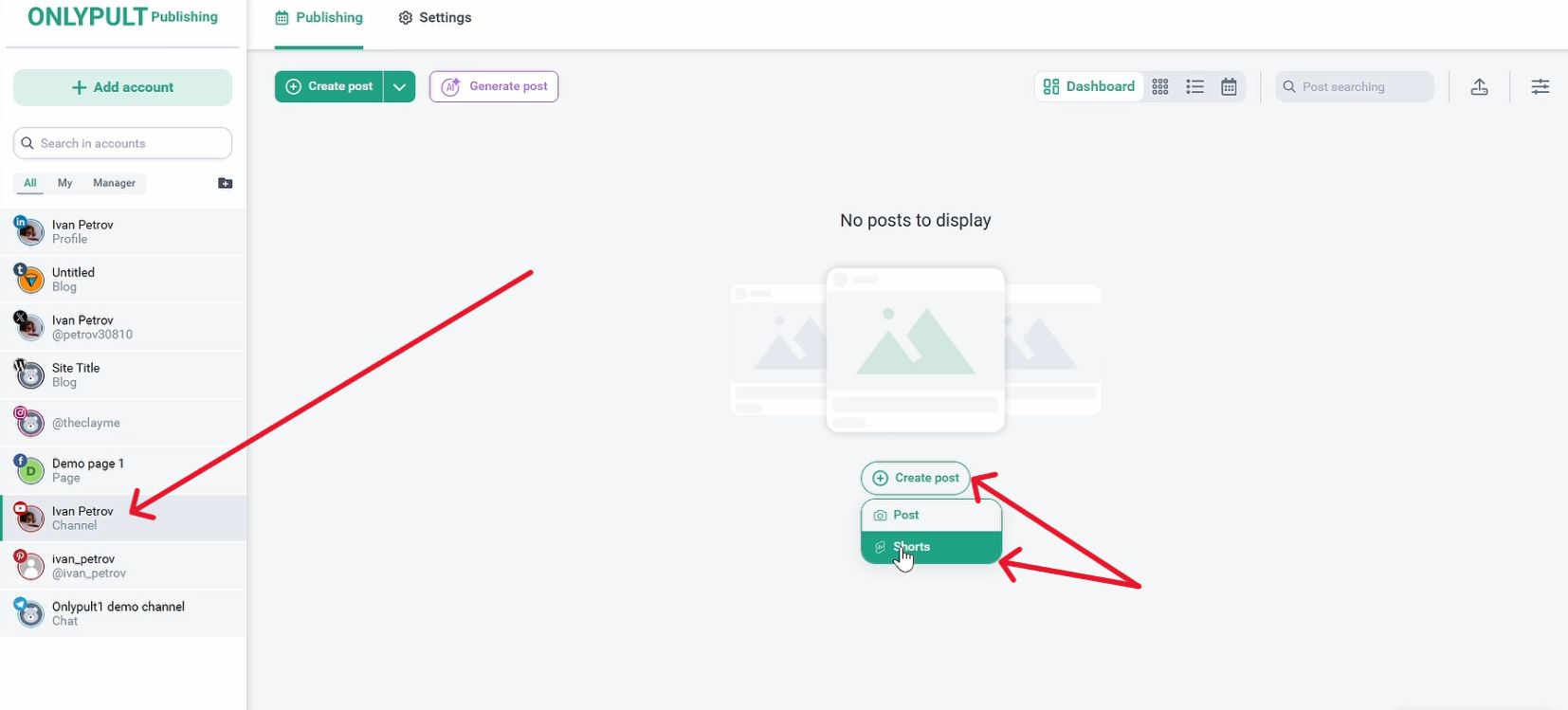- Go to the “Publication” section, click “Create publication” and select the Shorts item.