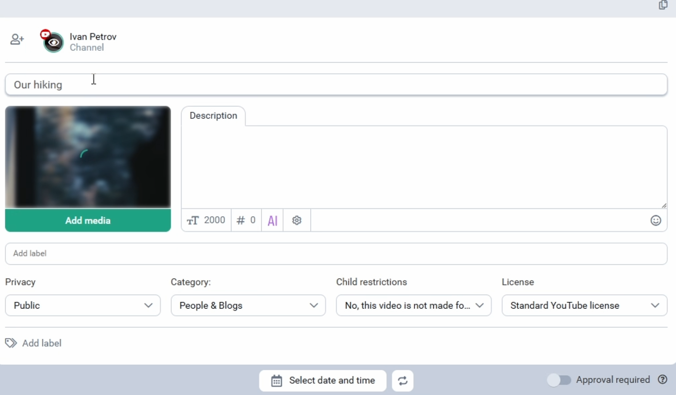 - In addition to the video, come up with its name and description. You can add hashtags and tags, as well as configure additional functions for this site. In addition, you can use an AI assistant to generate text and photos, create templates, and preview before publishing.
