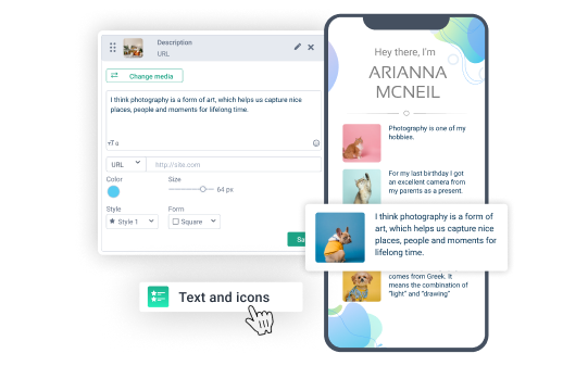 Carica la tua foto o logo aziendale per rendere riconoscibile il tuo sito web. Puoi anche importare un avatar dal tuo profilo di social media e utilizzare un editor semplice e basato su funzionalità se ne hai bisogno.