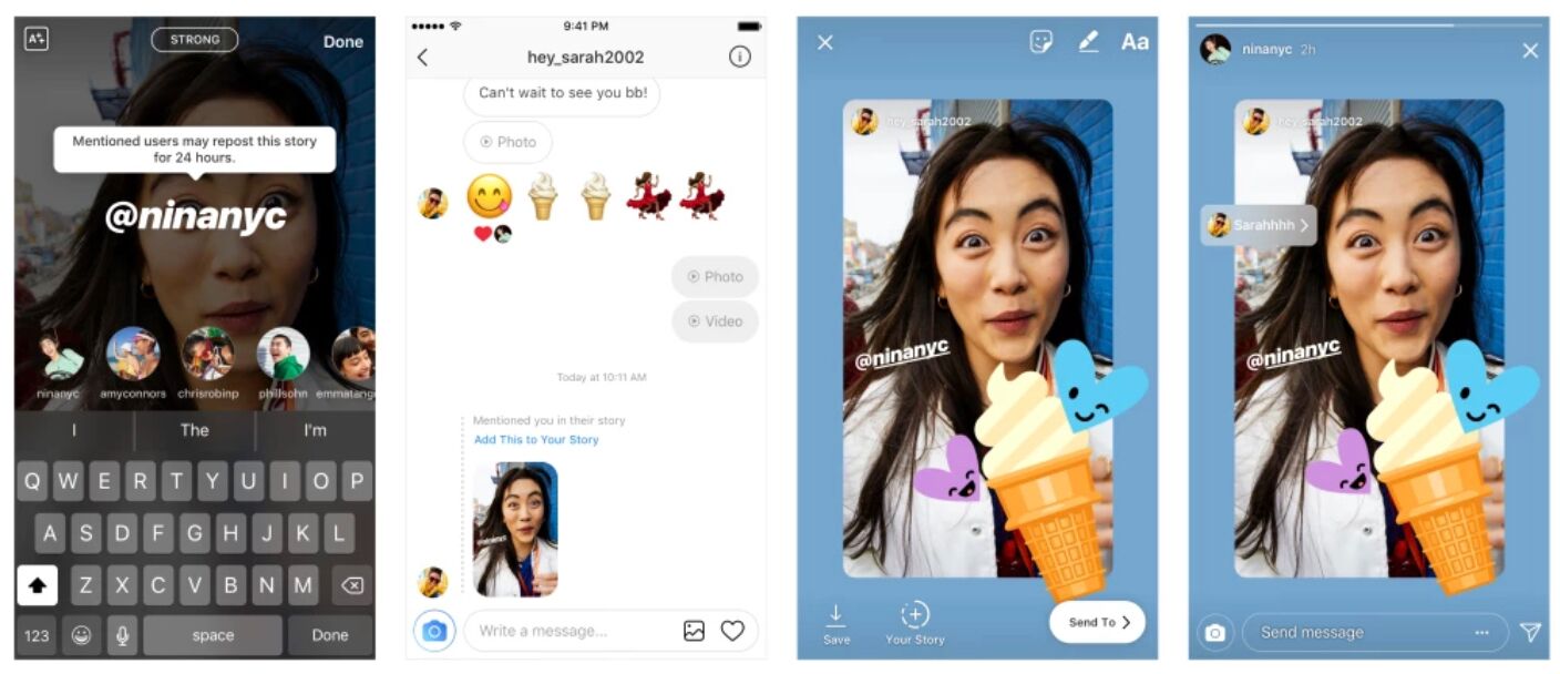 Упоминание другого пользователя в Истории позволяет ему удобно перепостить контент: как только вы опубликуете Историю с упоминанием, пользователь получит уведомление в Direct.