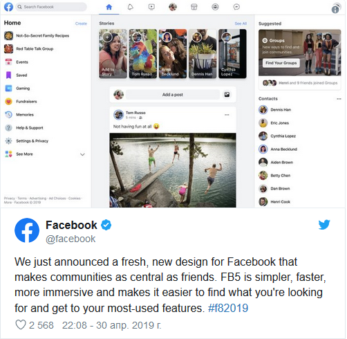 На конференции F8 были представлены новые интерфейсы веб-версии и мобильного приложения. Пообещали сделать темную тему для сайта (полезная функция для тех, кто сидит в соцсети ночью — не мешает остальным спать). Даже сказали, что сделают новую версию дизайна интуитивно понятной, а для этого сместят акцент внимания с ленты новостей на Истории.
