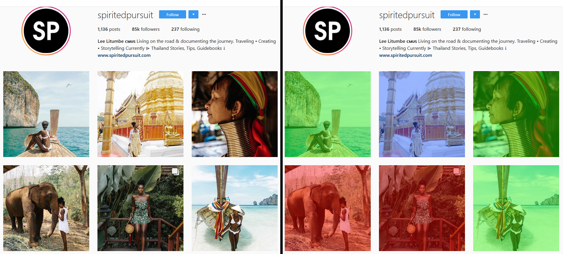 Почти идеальный пример – профиль блогера-путешественника Lee Litumbe (@spiritedpursuit): из последних 6 постов 3 о себе (отмечено зеленым), 1 информационный (отмечено синим) и 2 ненавязчиво рекламирующих/продающих поста (отмечено красным):