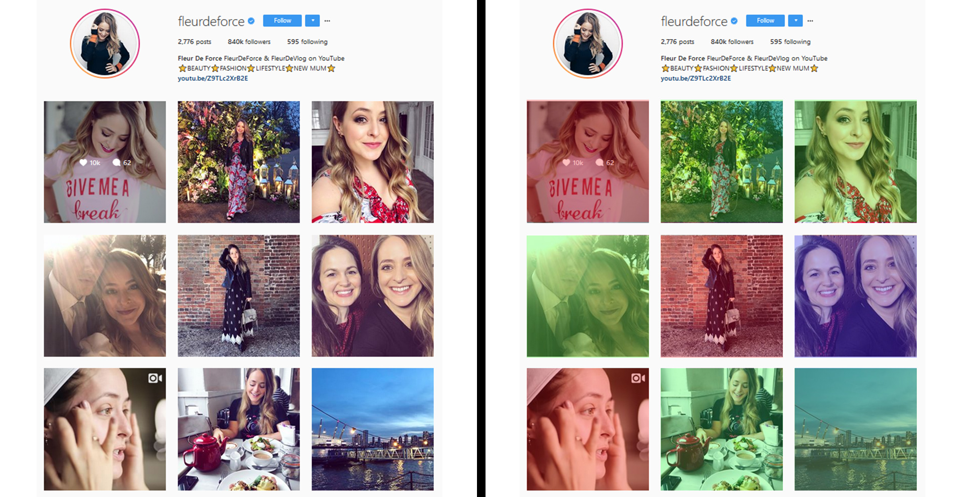 А вот популярный бьюти-блогер Fleur (@fleurdeforce) нашла собственную формулу эффективных постов: из последних 9 постов целых 6 о себе (отмечено зеленым), лишь 1 информационный (отмечено синим) и 3 явно рекламных поста (отмечено красным):