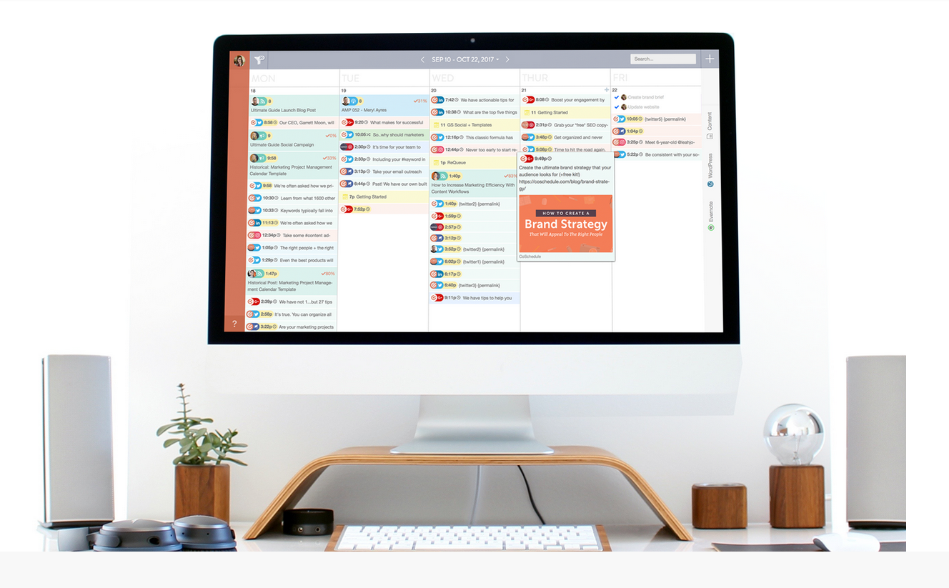 Откройте Google Sheets или создайте Microsoft Excel документ и создайте себе симпатичную таблицу с днями недели и слотами для тем постов. Если классика вам не по вкусу, можно использовать программы для планирования контента, например, CoSchedule или его аналоги: