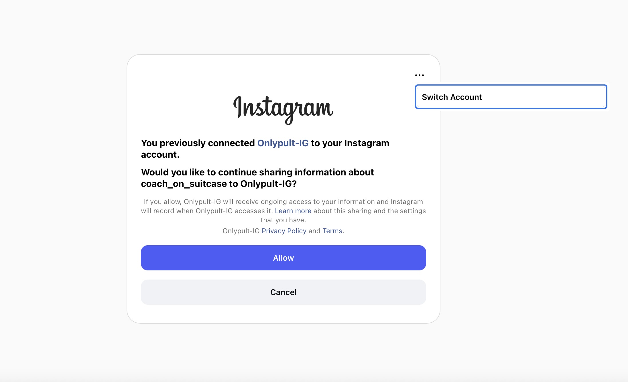 При желании подключить еще один аккаунт, рекомендуем использовать кнопку «Переключить аккаунт» в самом Instagram на этапе подключения приложения Onlypult.