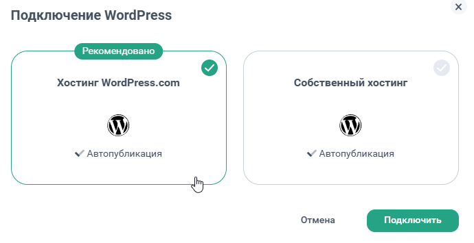 - Если сайт размещён на собственном хостинге, то выберете способ подключения “Собственный хостинг”, а если используется хостинг WordPress, то выберете “Хостинг WordPress.com”.