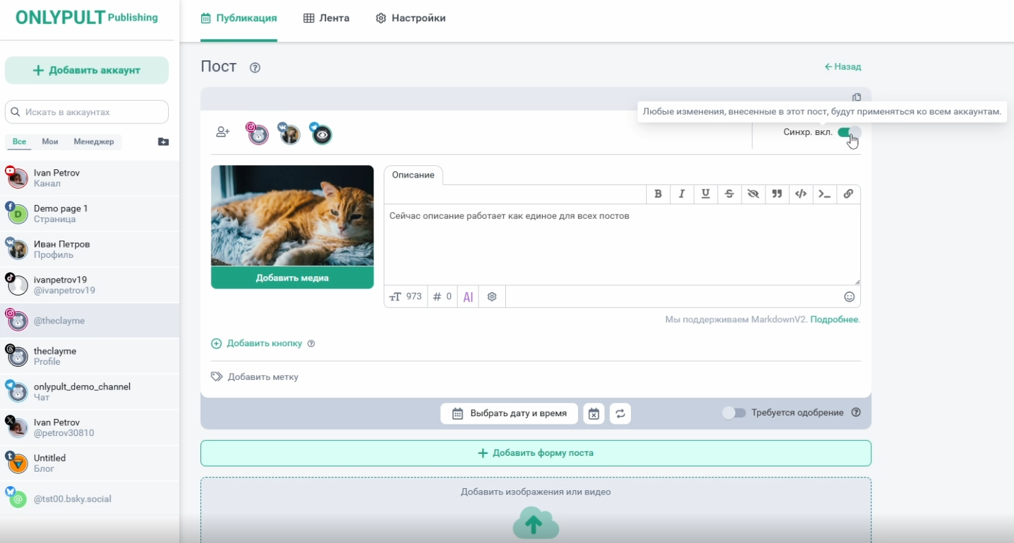 - В режиме Кросспостинга по умолчанию включена синхронизация. Это значит, что все изменения внесённые в один пост автоматически применятся и к другим. Если каждому посту нужно отдельное описание, то синхронизацию можно отключить.