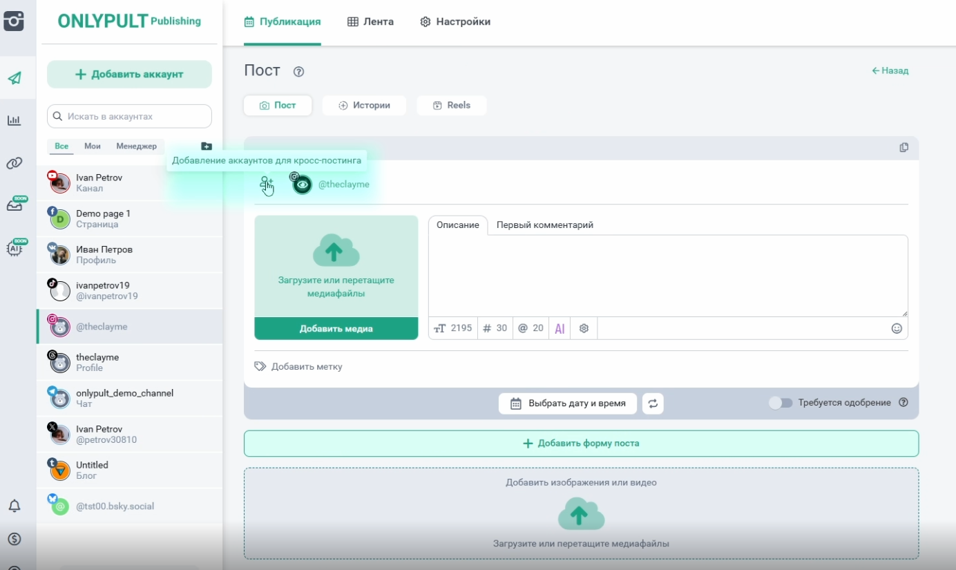 - Нажмите на иконку добавления аккаунтов для Кросспостинга, чтобы добавить нужные вам страницы.