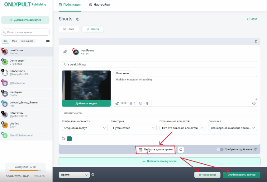 - После добавления всего необходимого настройте время публикации или нажмите “Опубликовать сейчас” или “Добавить в черновики”.