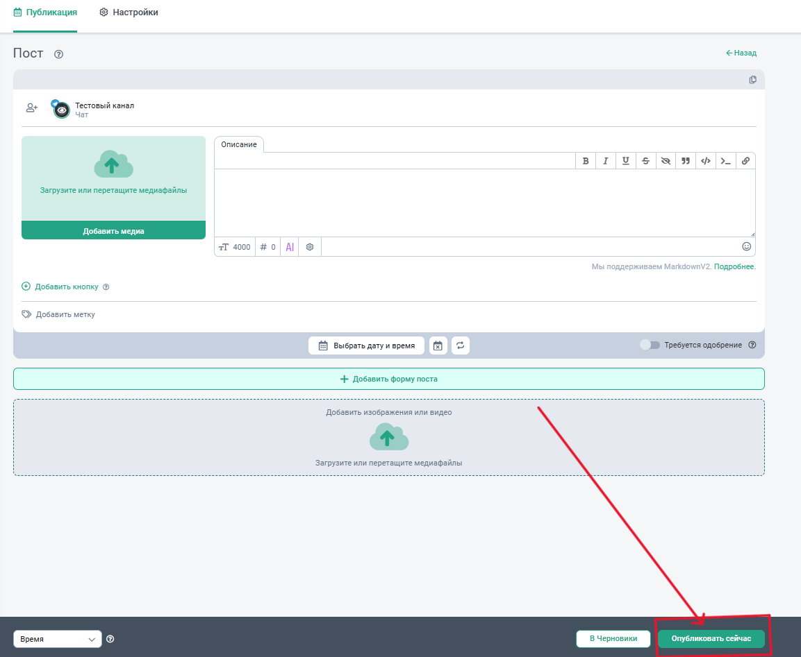 - Для того, чтобы пост вышел в самое ближайшее время, то в правом нижнем углу нажмите на “Опубликовать сейчас”.