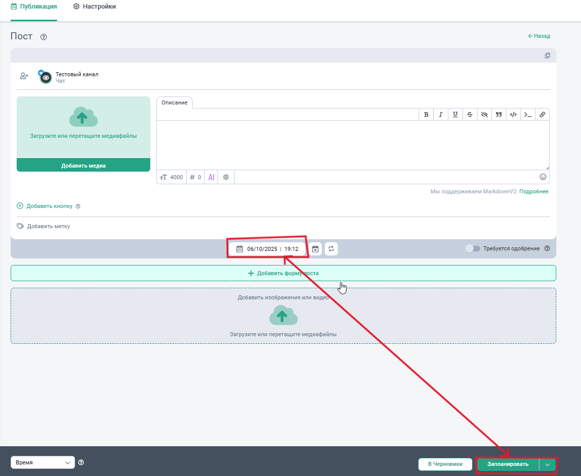 - Если вы хотите запланировать пост на конкретное время, то выберите дату и время, а затем нажмите “Запланировать”.