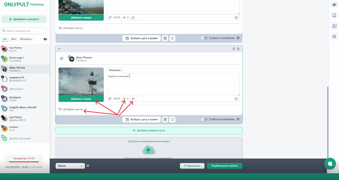 - В зависимости от социальной сети, для которой вы готовите пост, будут доступны разные возможности: добавление гео-метки, добавление хэштегов, отметка пользователей на фото. Также доступен ИИ-помощник для генерации текста и фото, функция создания шаблонов и предпросмотр перед публикацией.