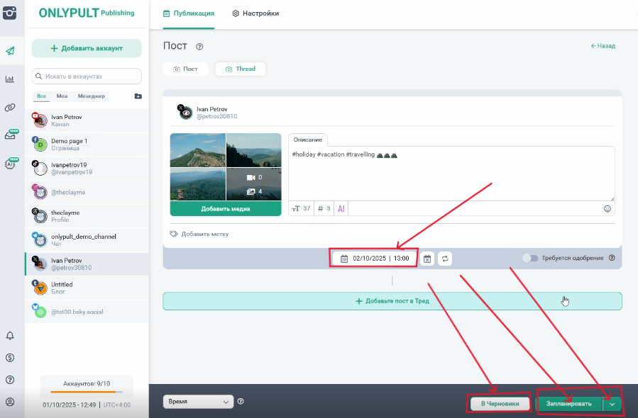 - После добавления всего необходимого настройте время публикации или нажмите “Опубликовать сейчас” или “Добавить в черновики”.