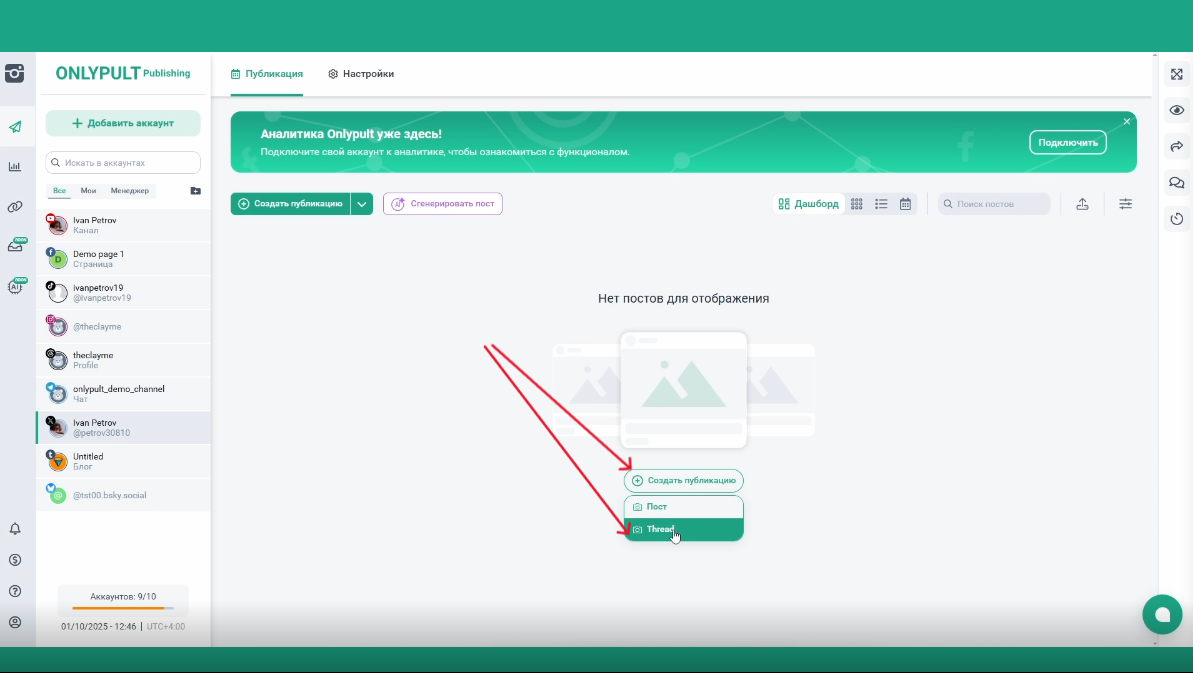 - Перейдите в раздел “Публикация”, нажмите “Создать публикацию” и выберите пункт “Thread”.