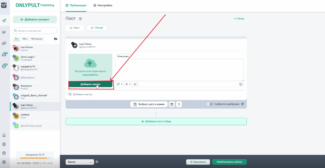 - В зависимости от социальной сети, для которой вы готовите пост, будут доступны разные возможности: добавление гео-метки, добавление хэштегов, отметка пользователей на фото. Также доступен ИИ-помощник для генерации текста и фото, функция создания шаблонов и предпросмотр перед публикацией.