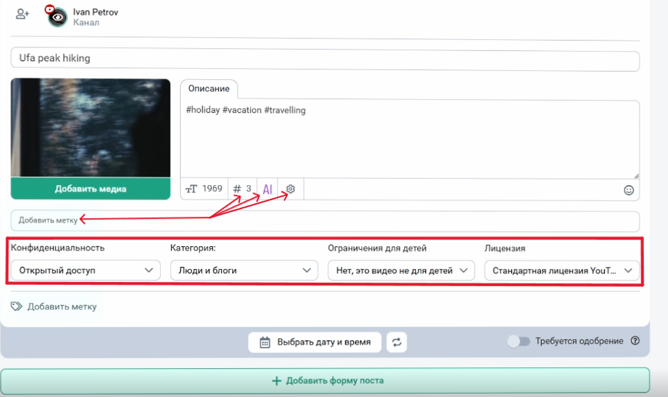 - В дополнение к видео придумайте его название и описание. Можно добавить хештеги и метки, а также настроить дополнительные функции для этой площадки. Кроме того вам доступен ИИ-помощник для генерации текста и фото, функция создания шаблонов и предпросмотр перед публикацией.