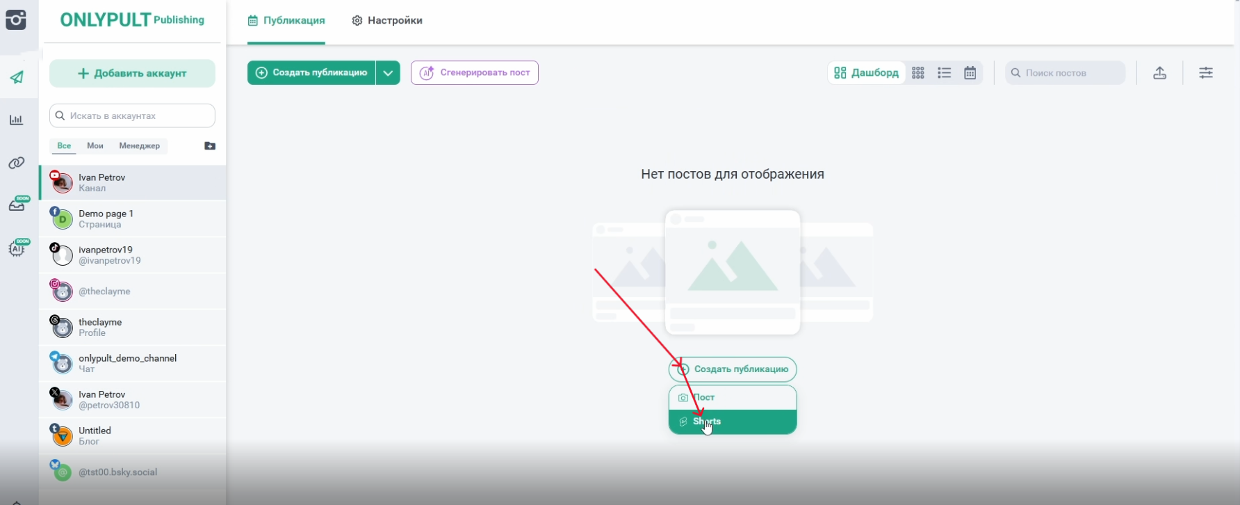 - Перейдите в раздел “Публикация”, нажмите “Создать публикацию” и выберите пункт Shorts.