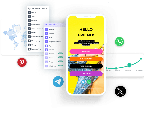 Создавайте неограниченное количество ссылок на любой ваш контент. Сделайте из своего мобильного сайта эффективную мультиссылку, которая решит проблему с нехваткой места для размещения ссылок в TikTok, Pinterest и других социальных сетях.