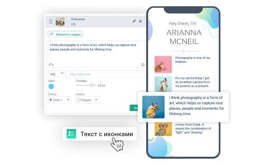 Оформляйте тексты во встроенном многофункциональном редакторе и создавайте броские заголовки и удобочитаемые описания в любом месте страницы. Используйте базу шрифтов и загружайте свои.